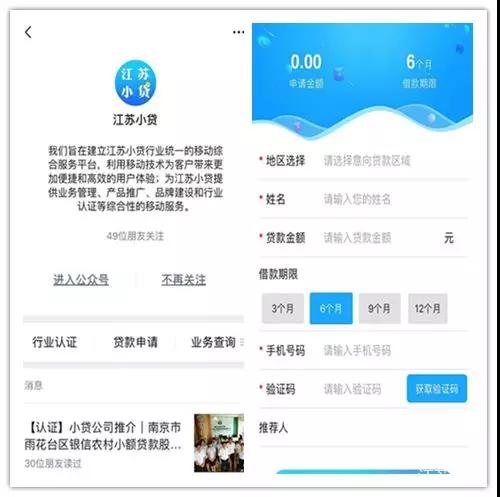微信公众号名为“江苏小贷”,作为金融科技服务平台三箭的最后一发,箭指广大C端用户核心痛点,为其提供正规小贷公司认证查询、贷款意向登记、贷款信息查询及还款提醒等功能,建立C端用户与小贷公司的纽带,推动江苏小贷行业健康发展。